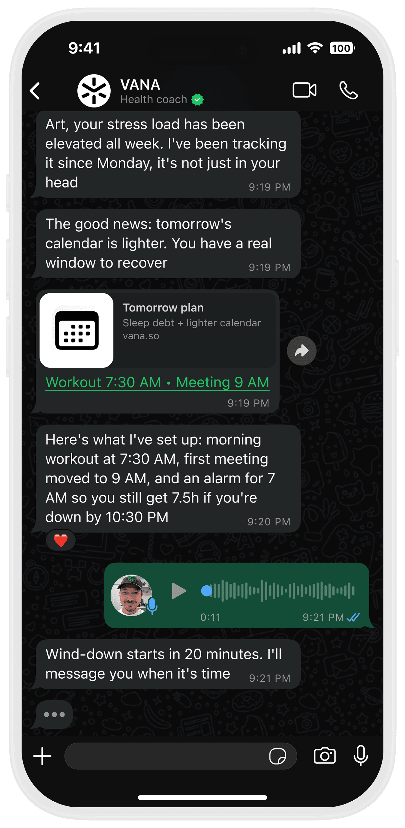VANA combines your wearable data, symptoms, and daily context to explain what changed in your body, and what to do today.